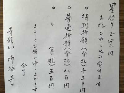 星祭り祈願のお申し込みを頂きましたお札を書いております。
